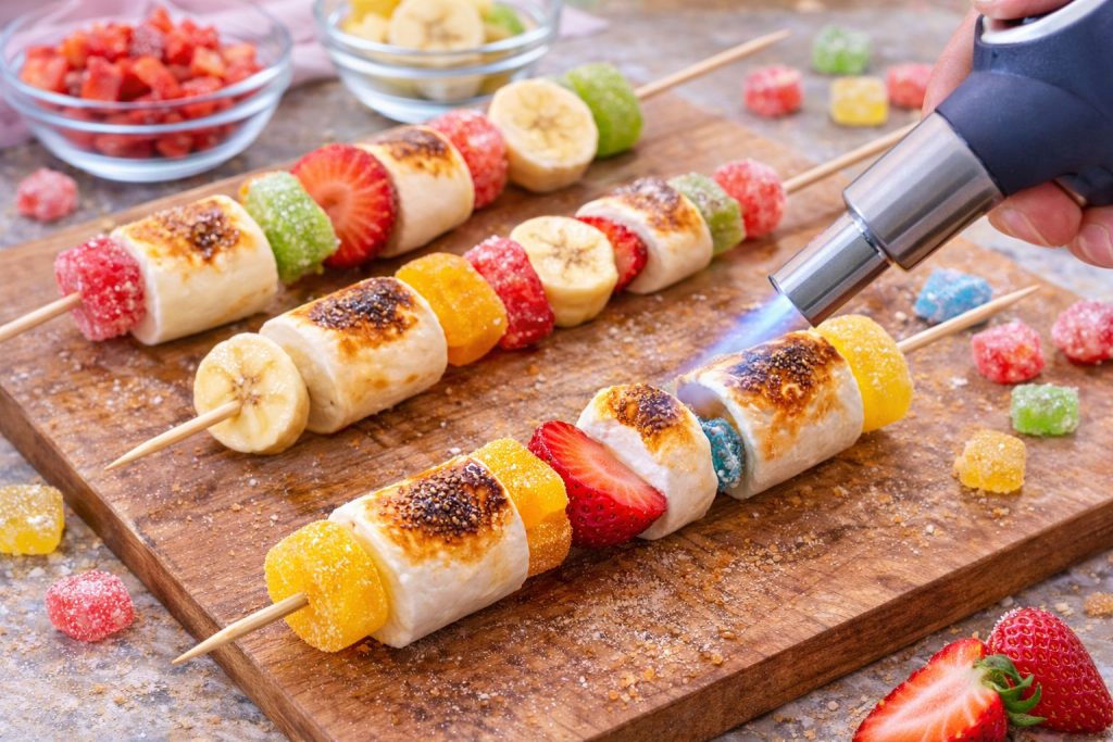 Passe les brochettes quelques secondes au-dessus d’une flamme ou dans une poêle chaude pour faire légèrement griller les guimauves.