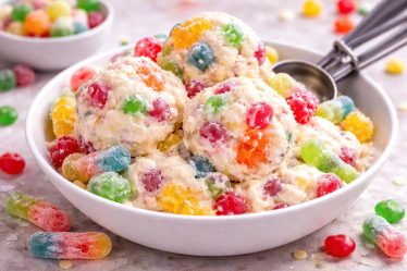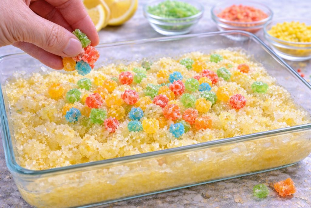 Lorsque la texture est bien granuleuse, ajoute les bonbons gélifiés coupés en petits morceaux.